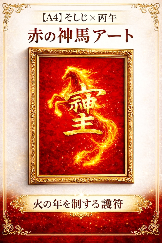 【商品仕様】 サイズ:A4 仕様: 高品質プリント 一年間飾ることを前提とした年運アートです。 強い火のエネルギーを持つ丙午は、 行動力や突破力をもたらす一方で、 使い方を誤ると、消耗や空回りにつながりやすい年とも言われています。 本作品は、その火の力を鎮めるのではなく、 整え、正しい方向へと導くことを意図して生まれました。 【そしじとは】 「そしじ」は 「宗」「主」「神」を合わせた造語で、 この一文字の中に 愛・調和・感謝の意味が込められていると伝えられています。 高い周波数を持つ文字とされ、 自身の波動を整え、 場や人をネガティブなエネルギーから守るとも言われています。 「この文字を置いた場所は、 直ちに浄化され、光が降りる」 そんな言い伝えも残されています。 【文字の構造に込められた意味】 「そしじ」は、 天と地をつなぐ神聖な構造を一文字に宿しています。 ・宀(うかんむり) 神殿や廟の屋根を表し、 祈りと静寂、神聖な空間の象徴 ・示(しめすへん) 神を迎える祭壇 神意や啓示が示される場 ・申(もうす) 稲妻を象った文字 天から地へと降りる神の意志、啓示の光 ・主(ぬし) 神聖な火を守り、 空間と魂の中心を司る存在 これらが一体となり、 「そしじ」は 神意を受けとり、光を降ろす“場”そのもの としての意味を持つ文字とされています。 【主(ぬし)が示すもの】 「主」は、 神聖な火を灯し、守る人の象徴。 火は神を迎える光であり、 その火を扱う存在は、 空間や人の中心軸を保つ役割を担っていました。 「そしじ」に含まれる「主」は、 その人やその場所の ぶれない中心、魂の軸を整える力を象徴しています。 【この文字にまつわる言い伝え】 ・痛みのある場所に貼ると和らいだ ・枕の下に置くと深く眠れた ・植物の下に置くと元気に育った ・水の結晶が美しくなった ・場の空気が澄んだ など、さまざまな体験談が語られています。 感じ方や捉え方には個人差があり、 科学的に検証されたものではありませんが、 感受性の高い方ほど、 何かを感じ取ることがあるかもしれません。 【この作品について】 赤は火の象徴。 神馬は、火の力を前進力へと変える存在。 「そしじ」と神馬を組み合わせることで、 丙午の強い年運を 消耗ではなく、繁栄と行動力へと整えることを意図しています。 【おすすめの飾り場所】 ・玄関 ・リビング ・仕事机の正面 ・寝室の頭側 直射日光を避け、室内でお楽しみください。