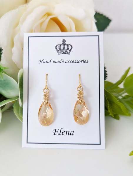 やさしいゴールドカラーが上品に揺れる、しずく型のスワロフスキーピアスです。