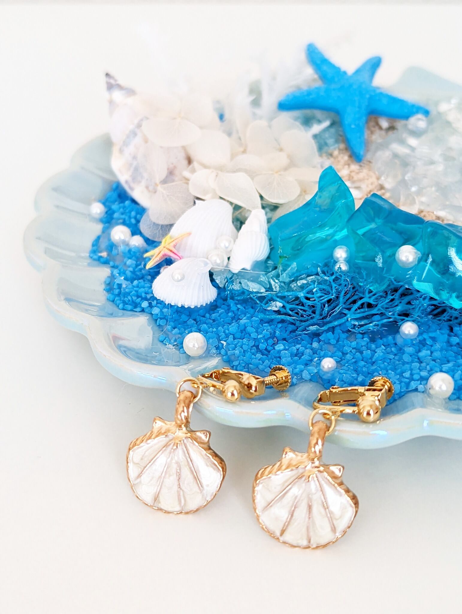 夏の光をやさしく反射する、白いシェルチャームのピアスです。