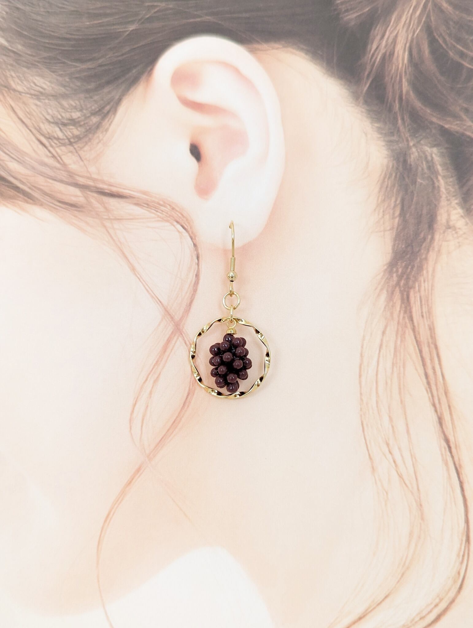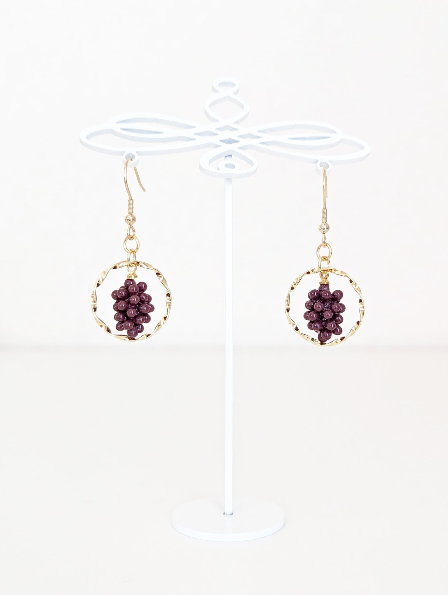 深みのある赤紫のビーズが、熟した赤ぶどうの房を思わせるピアス。