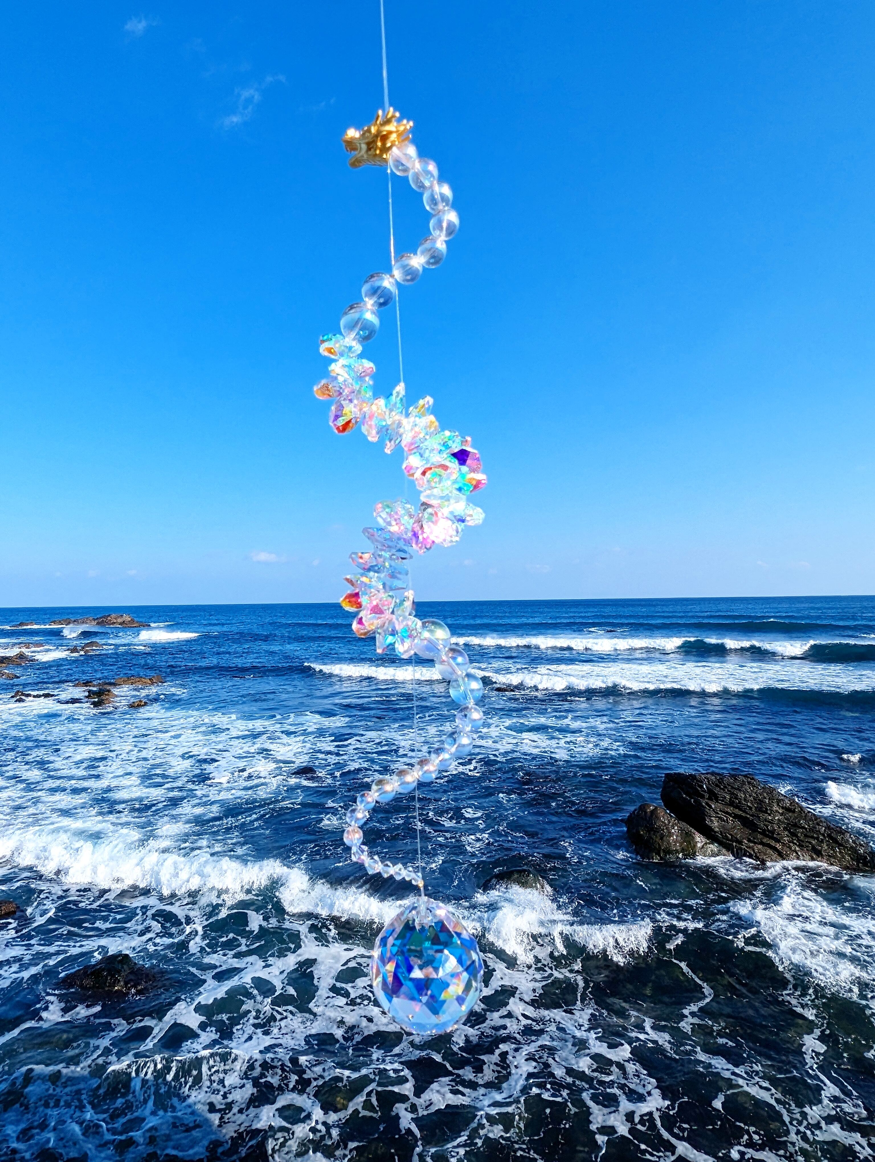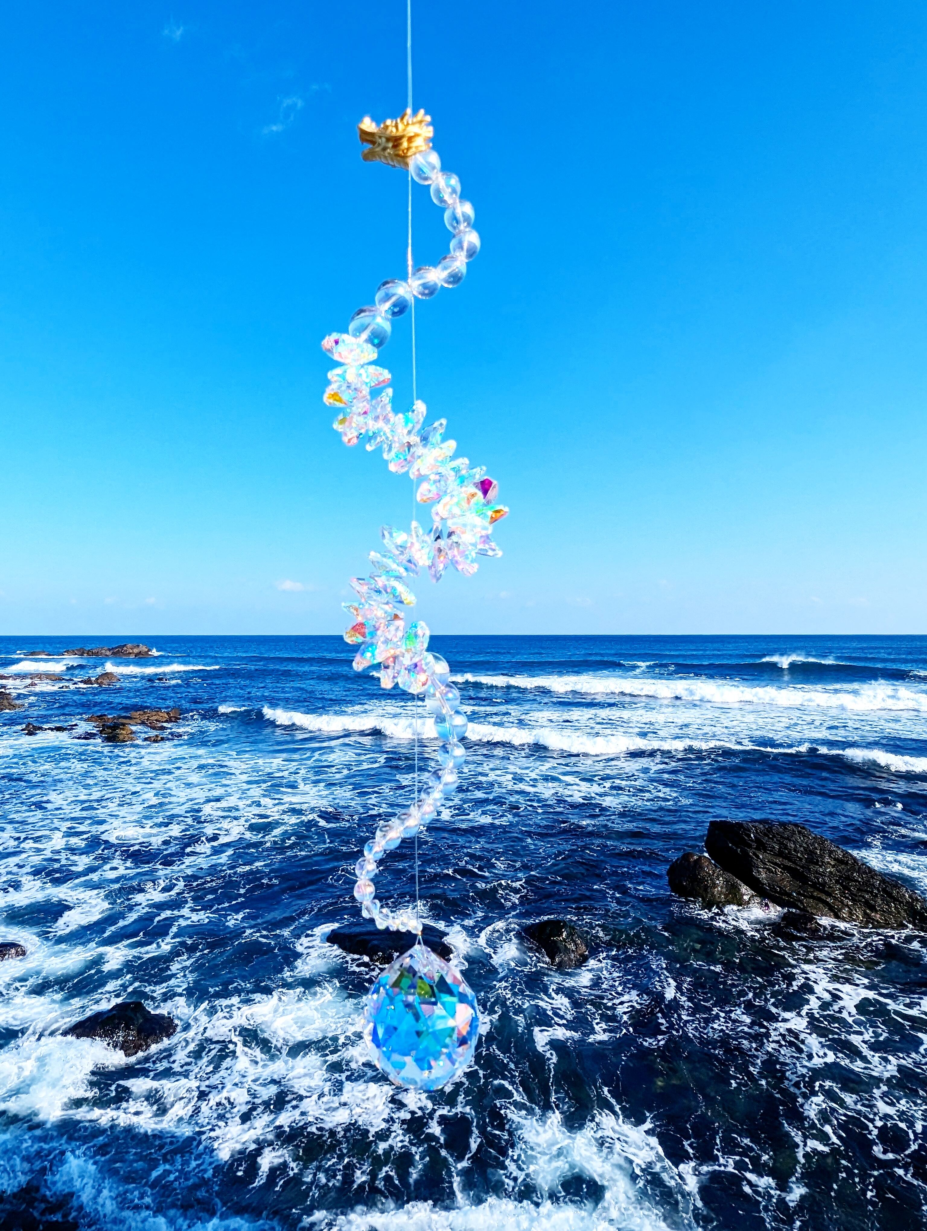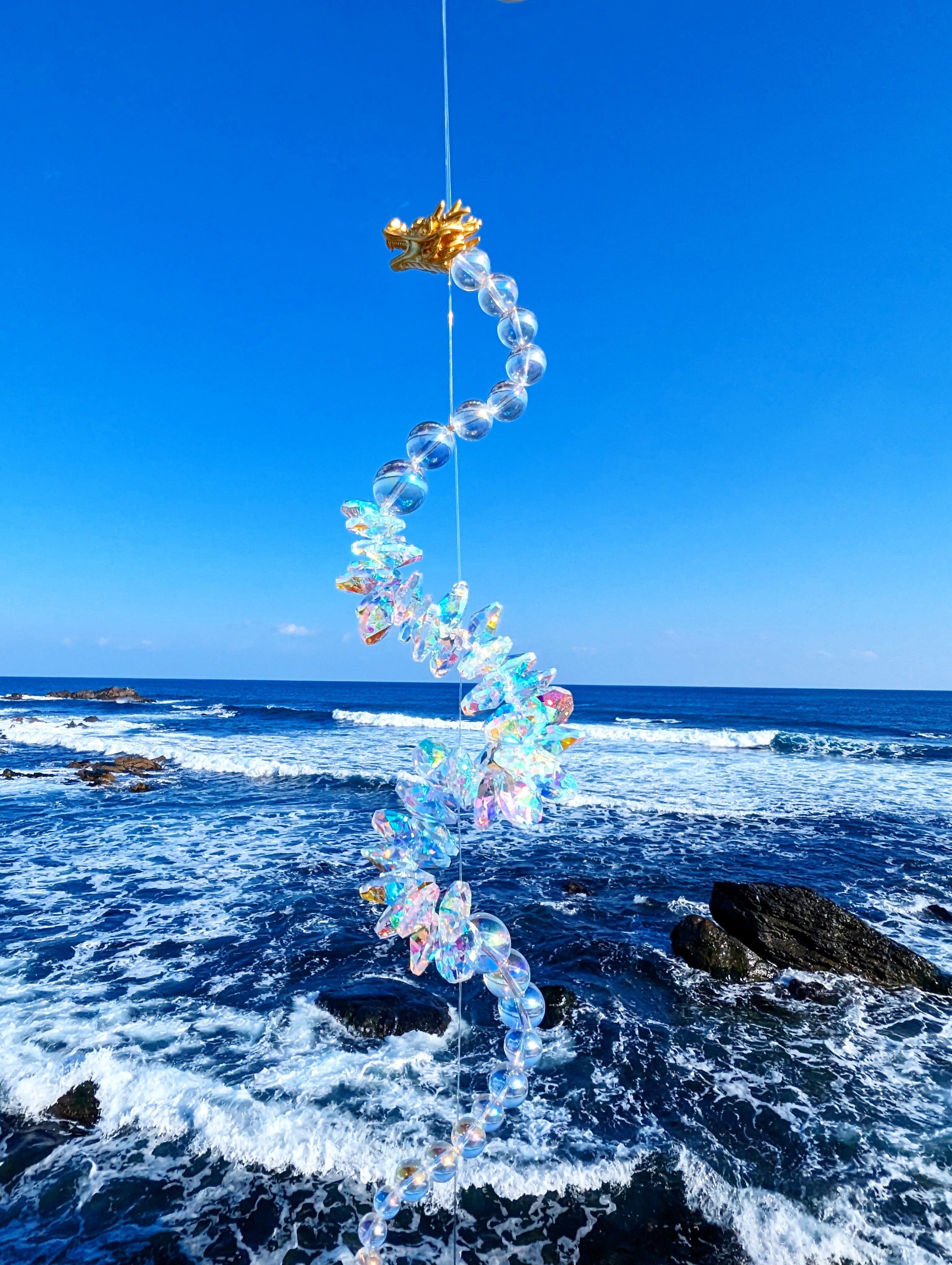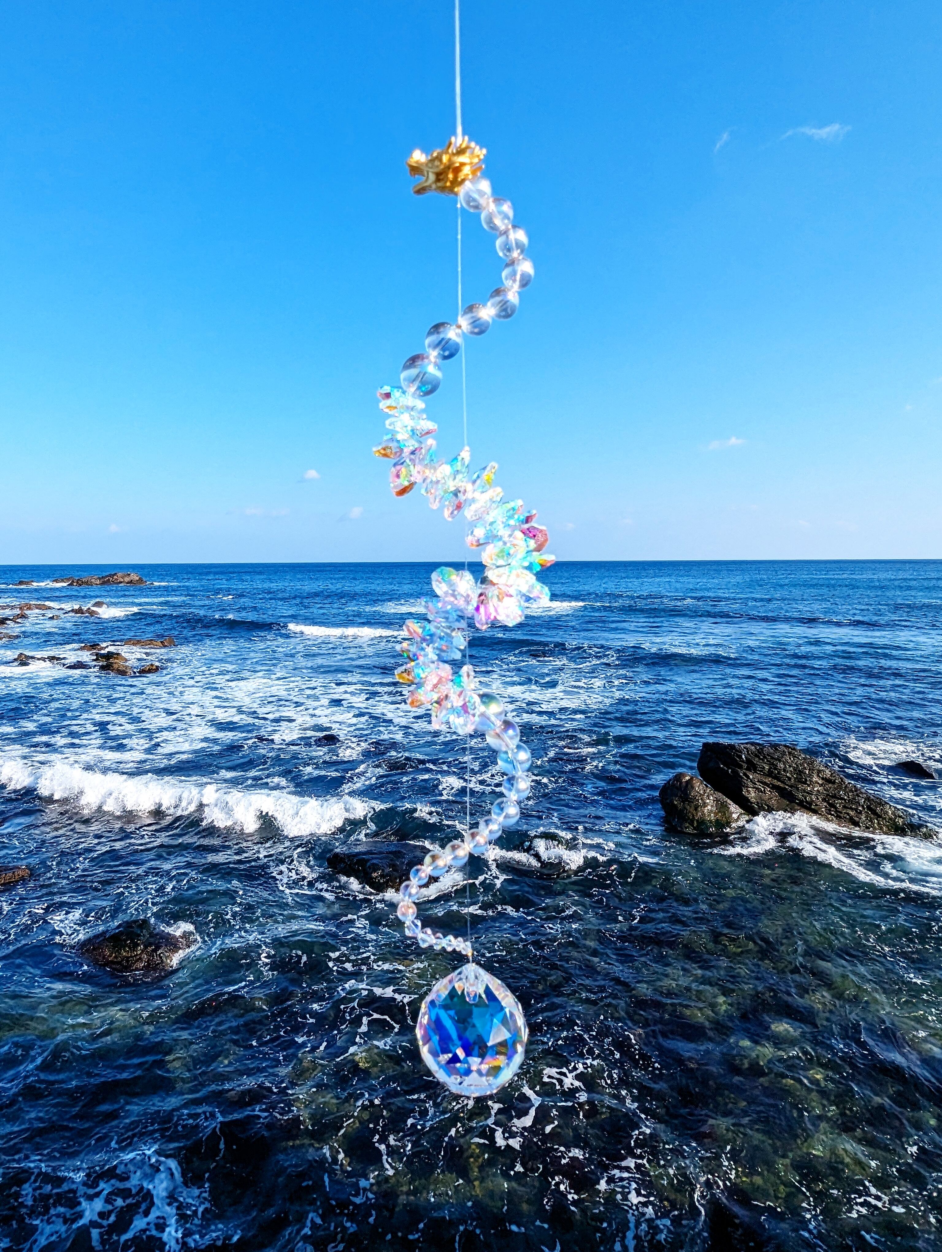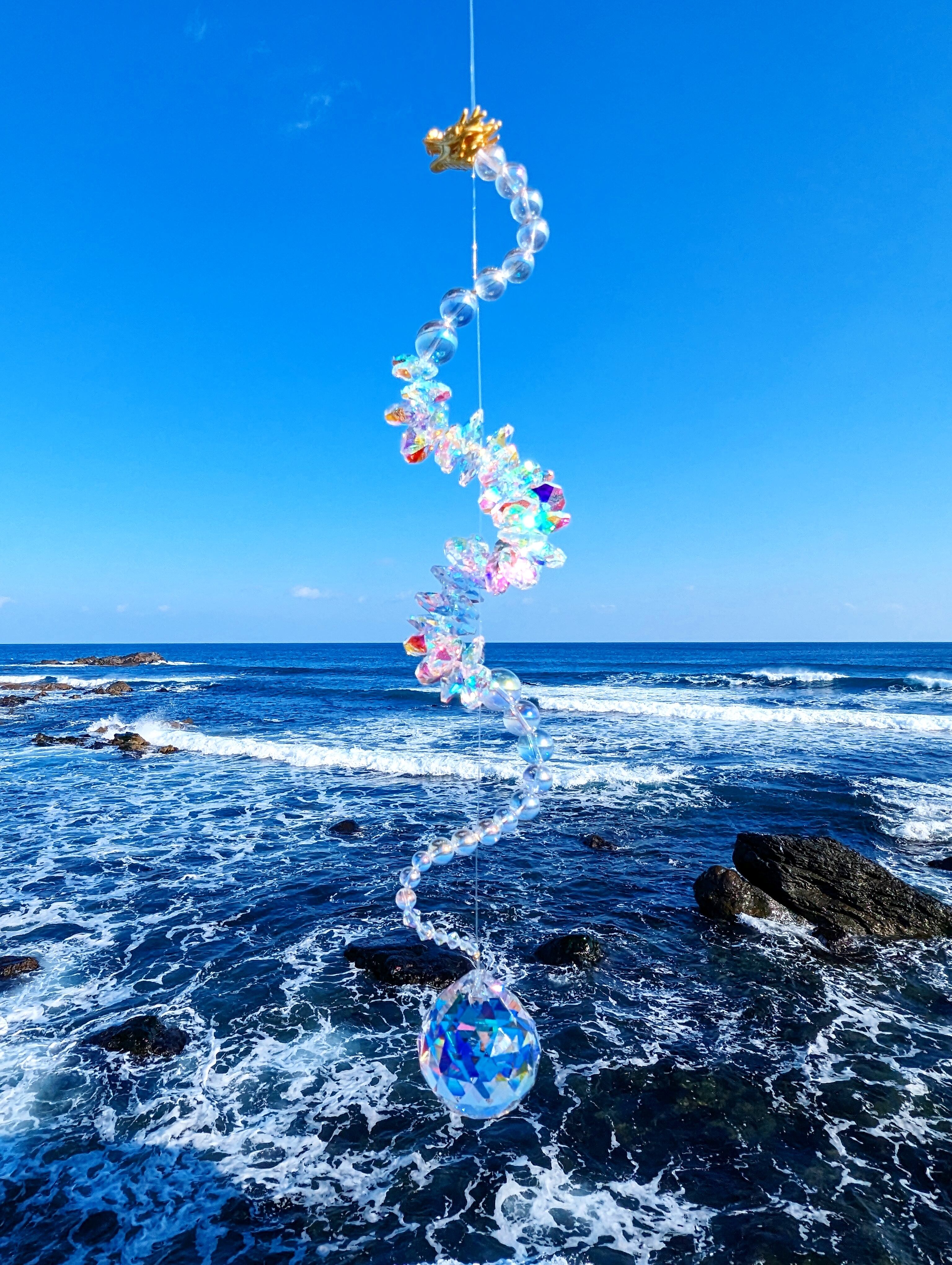 光を受けるたび、空間に沢山の虹が広がる、存在感のある龍神サンキャッチャーです。