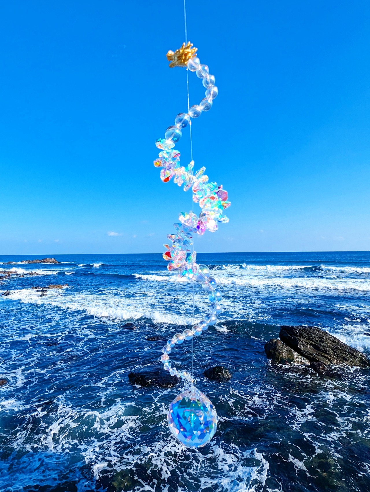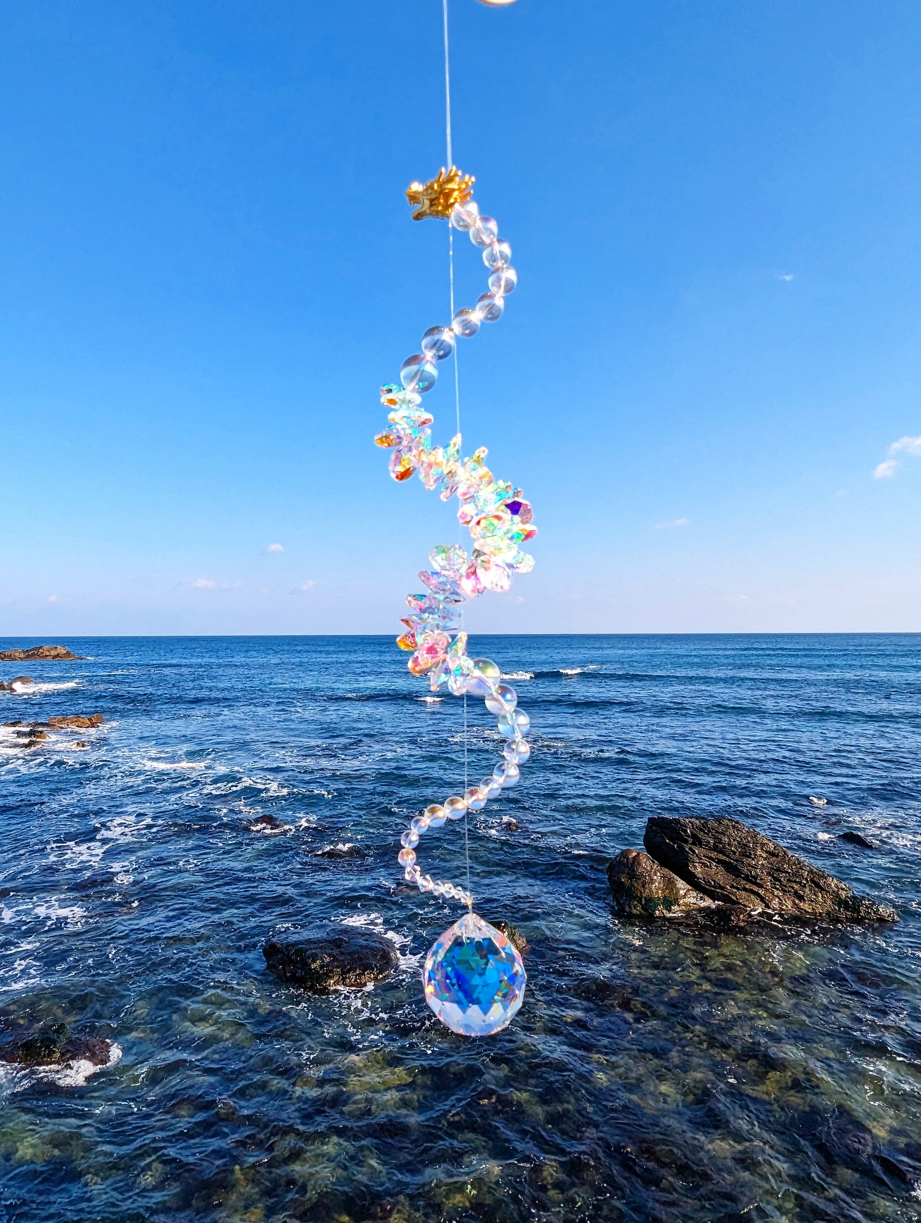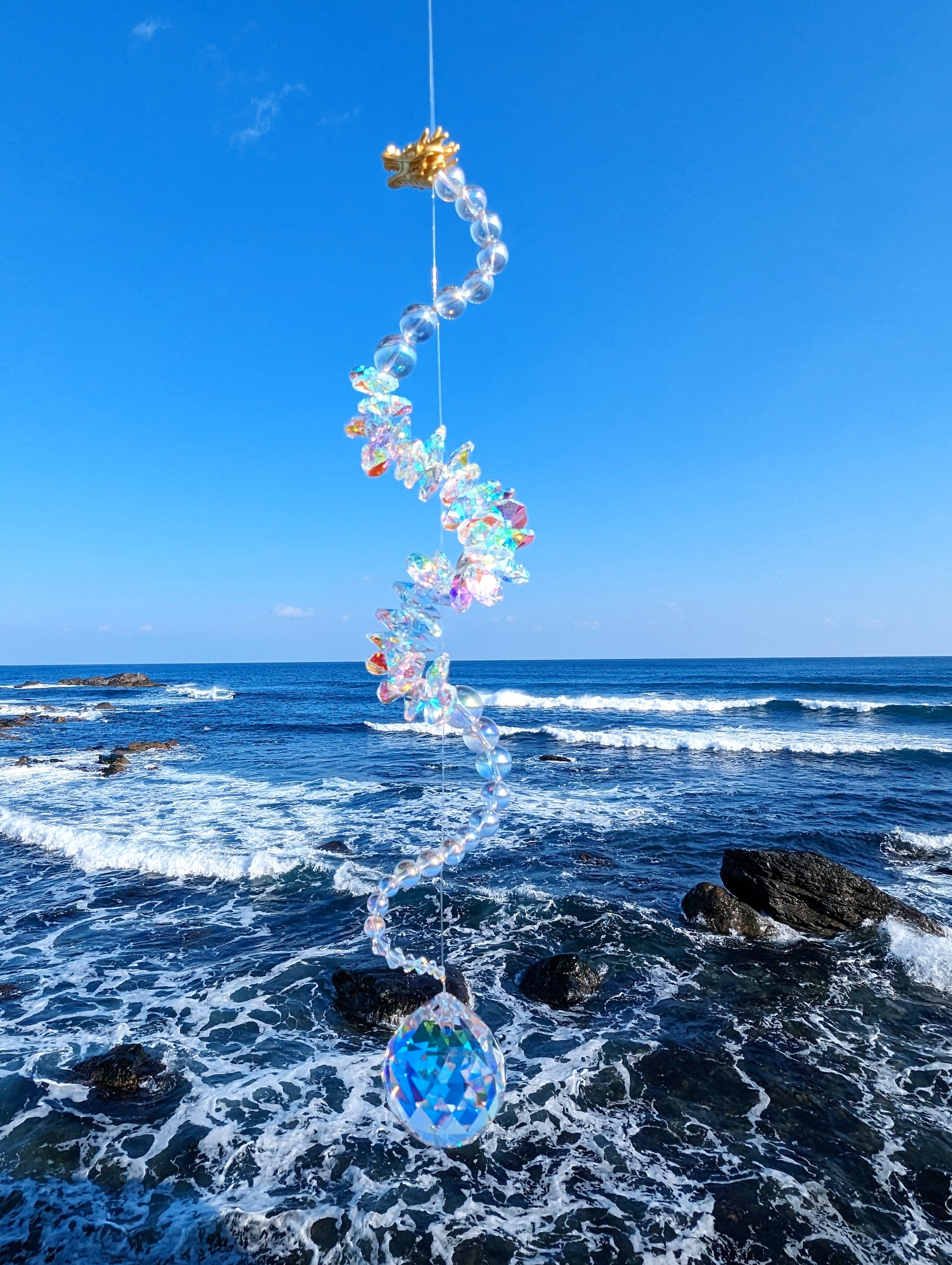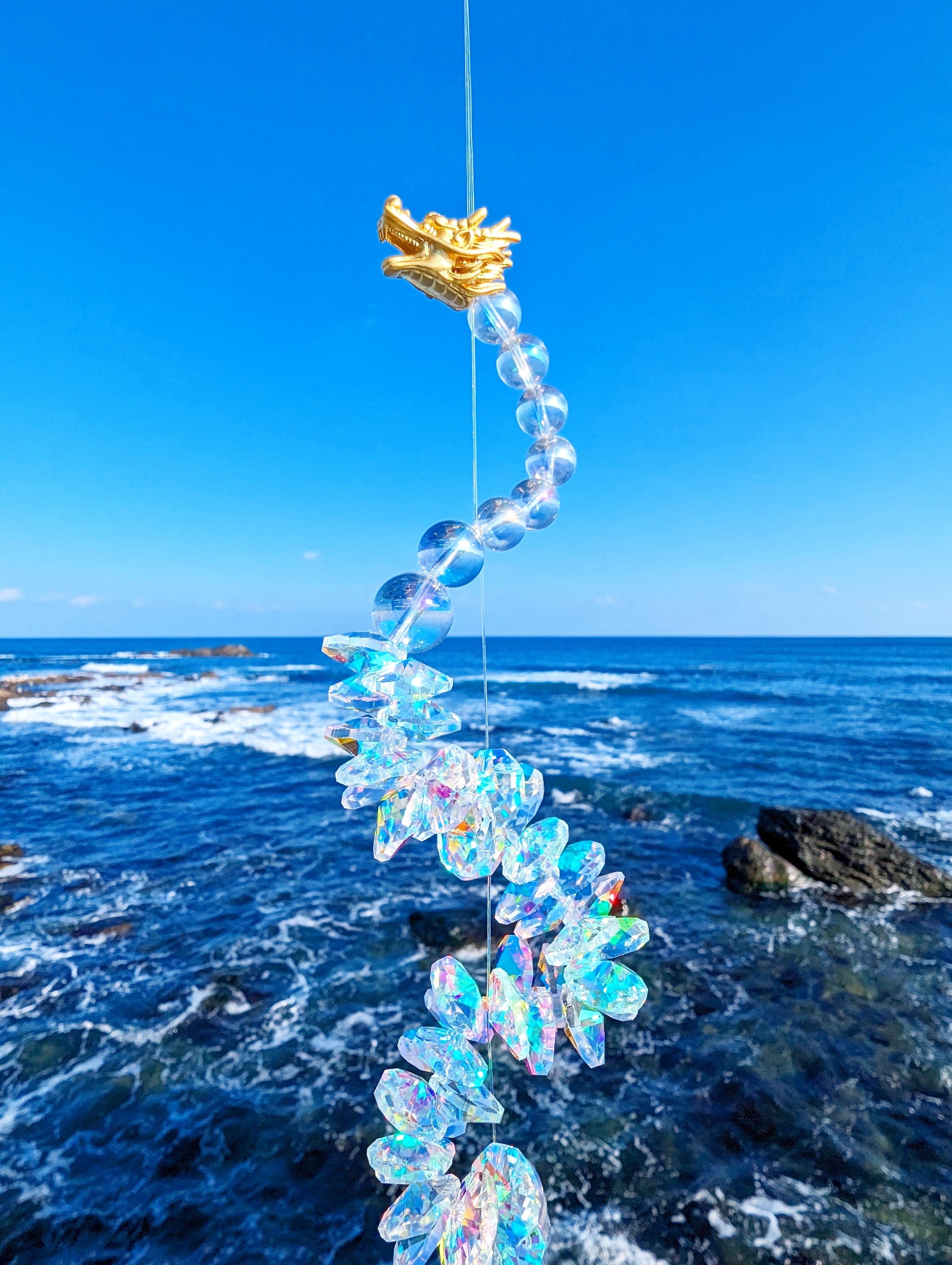 光を受けるたび、空間に沢山の虹が広がる、存在感のある龍神サンキャッチャーです。