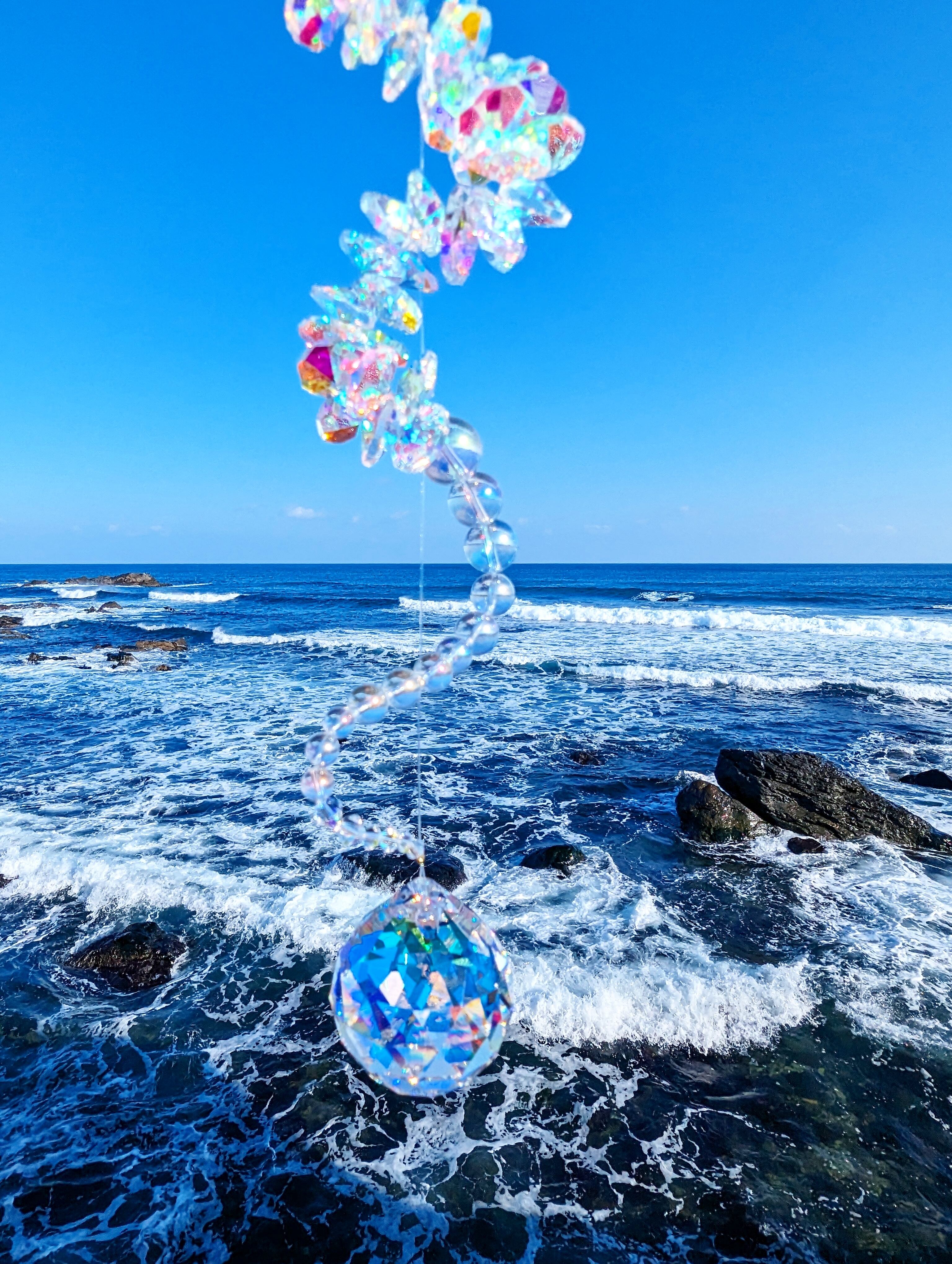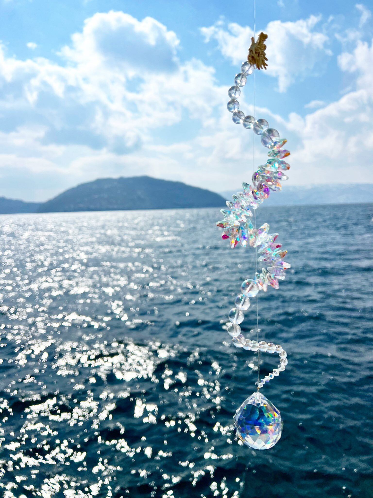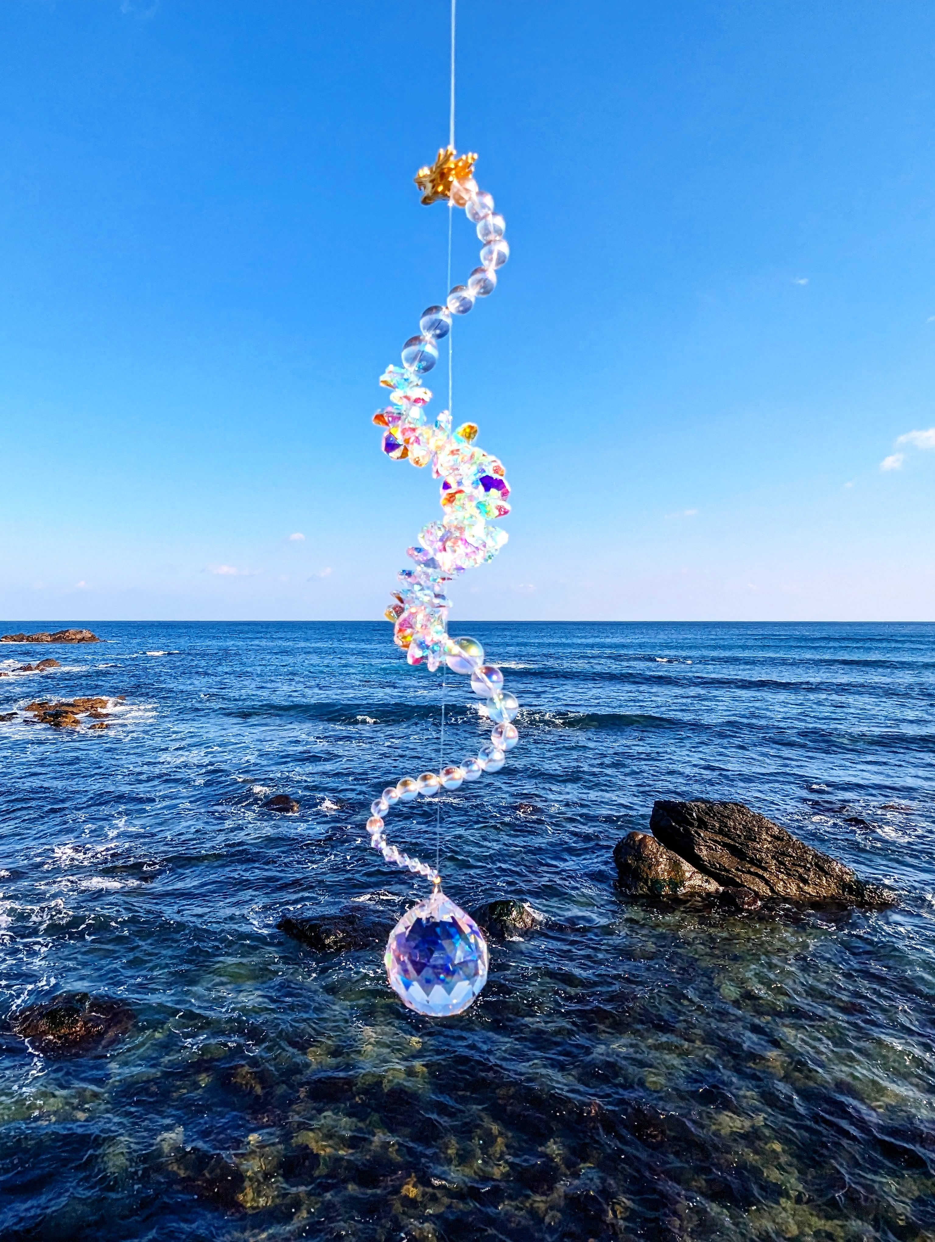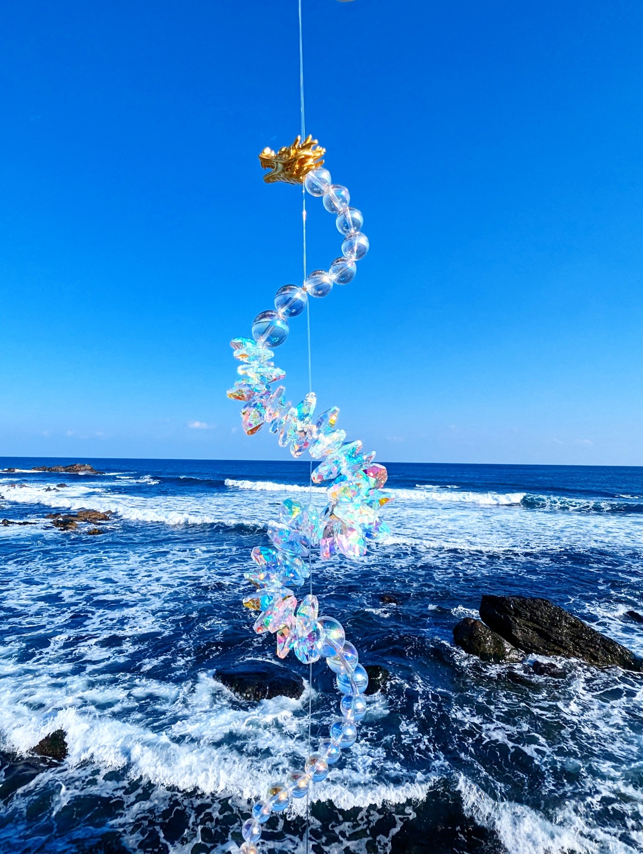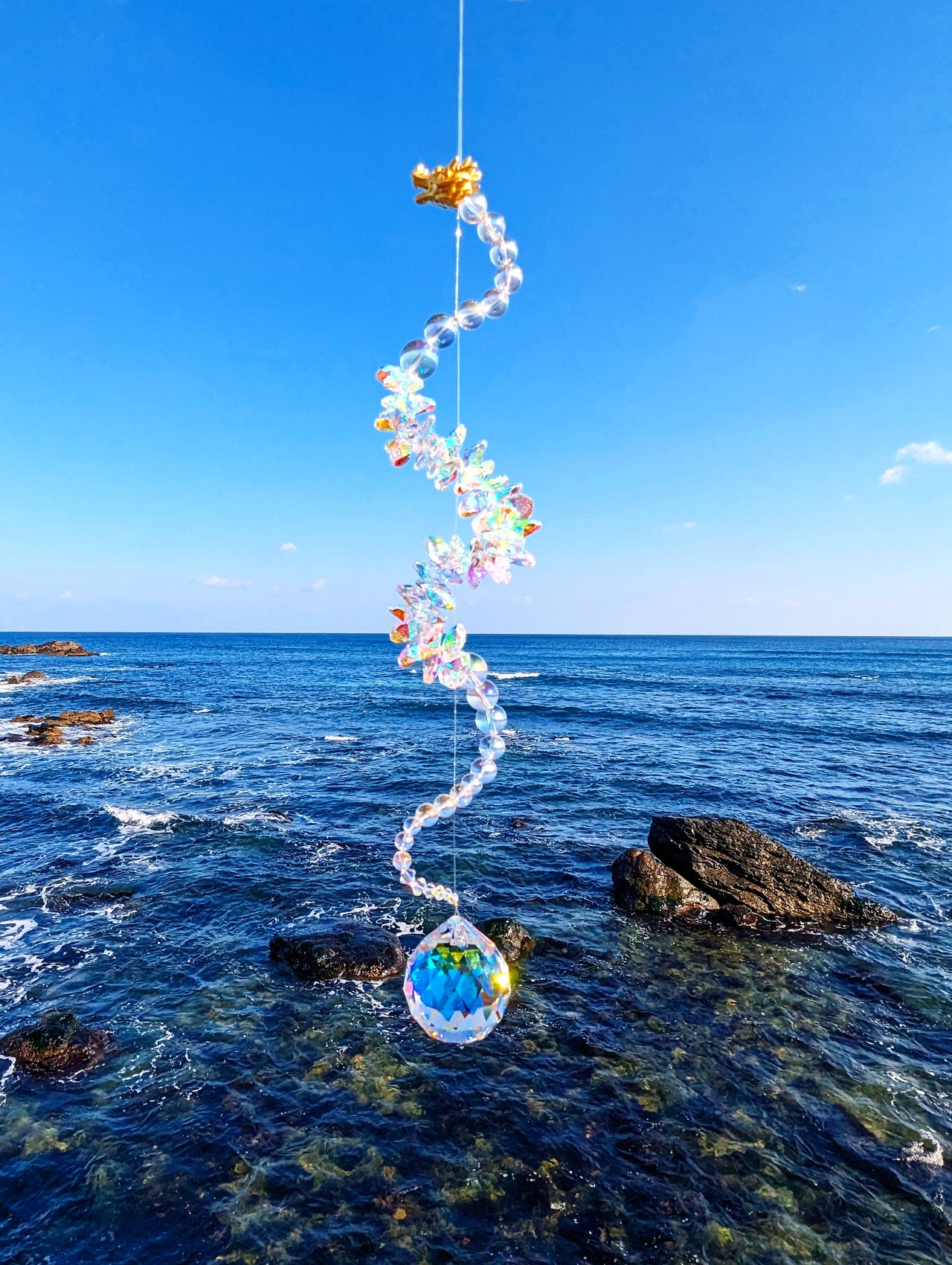 光を受けるたび、空間に沢山の虹が広がる、存在感のある龍神サンキャッチャーです。