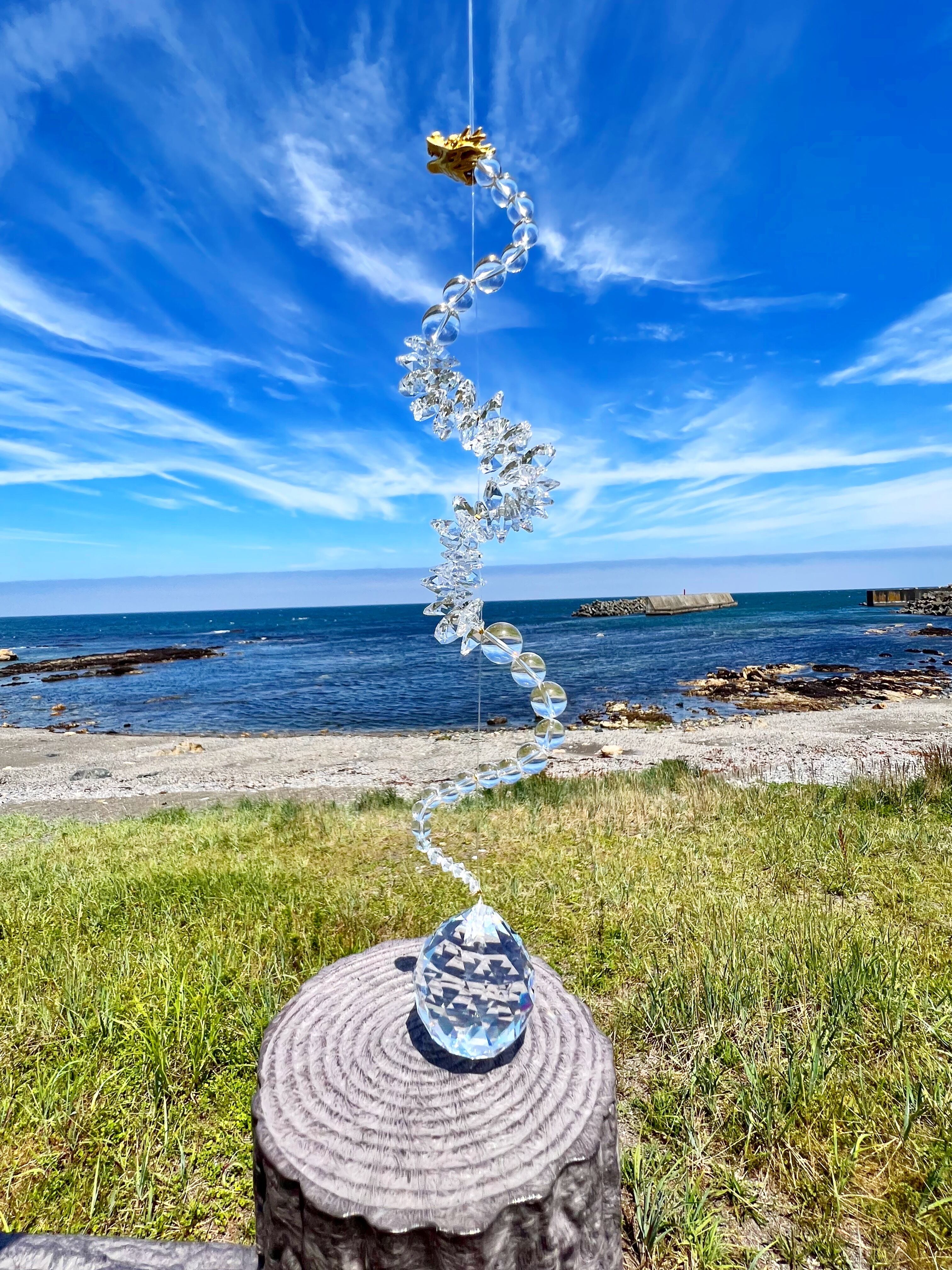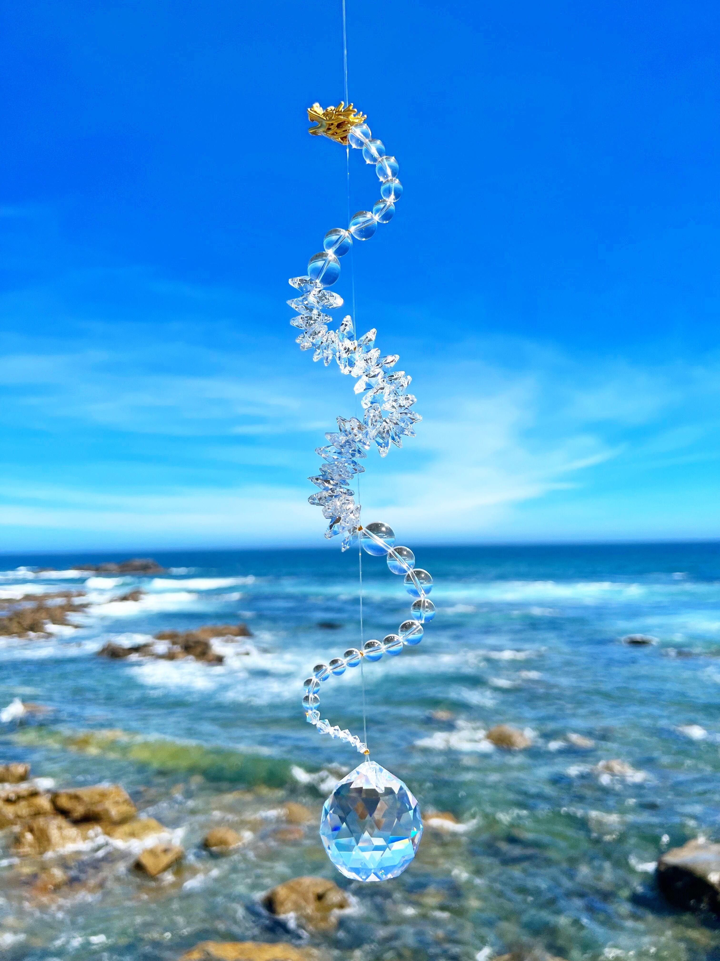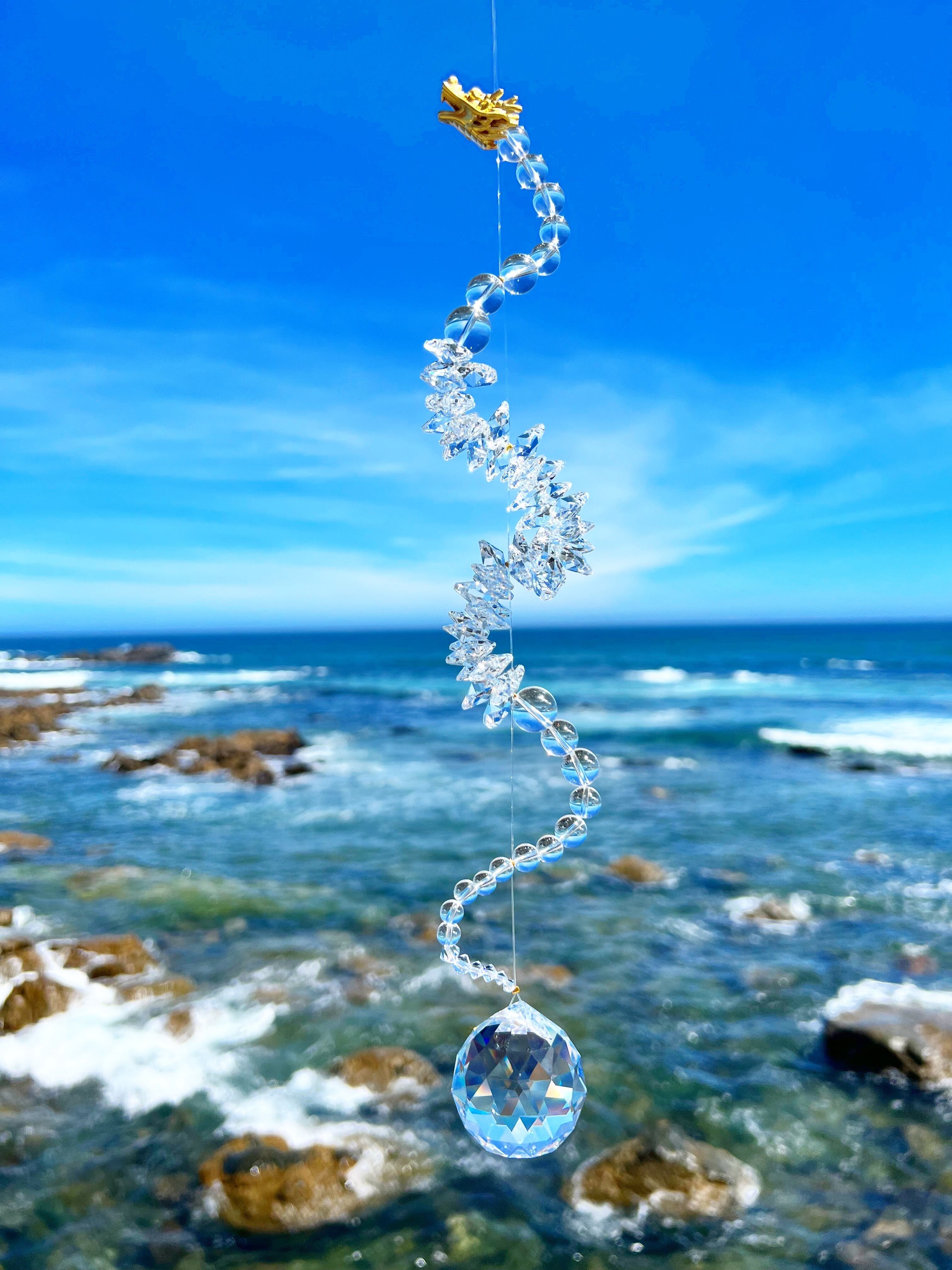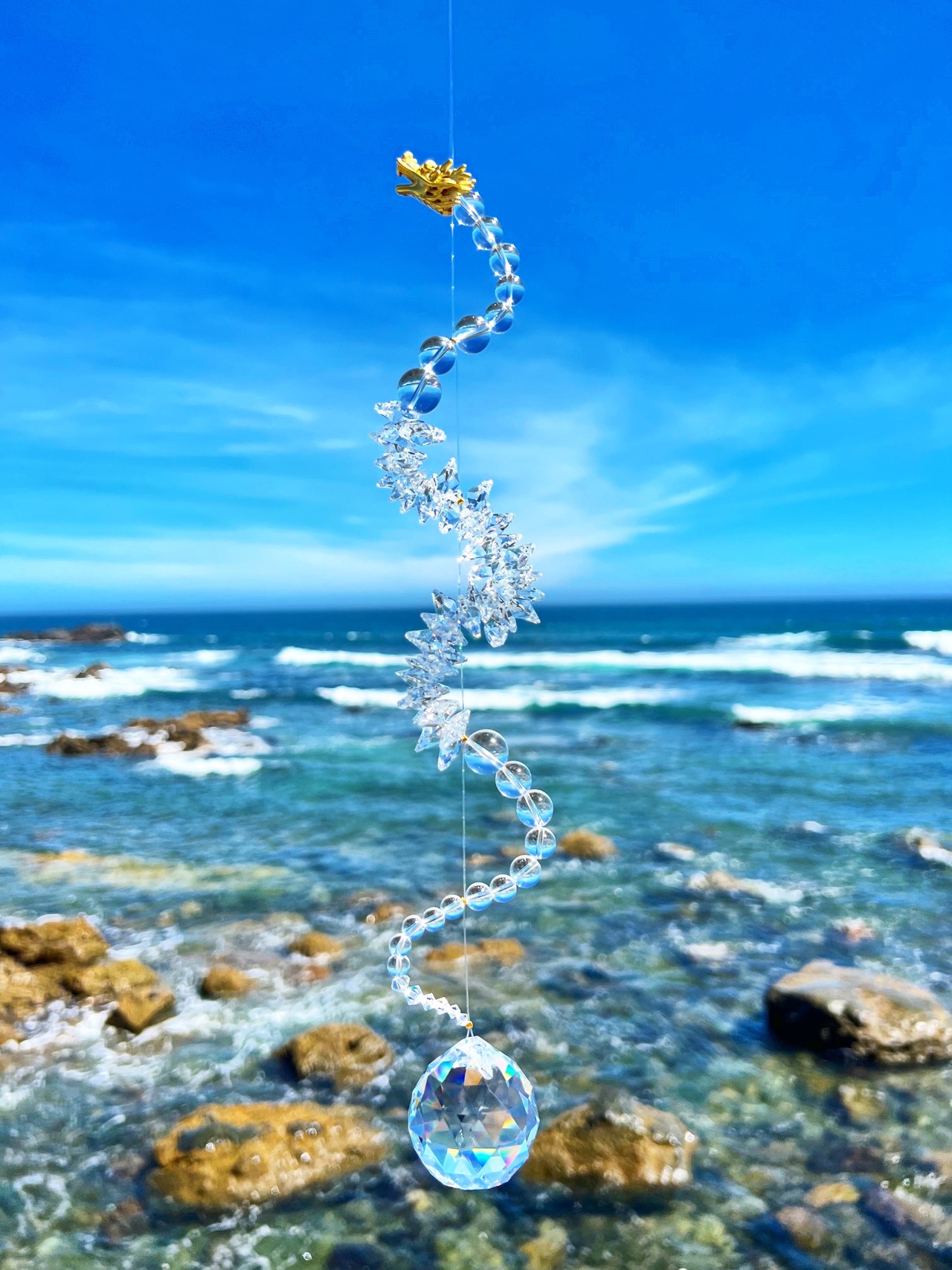 「龍神サンキャッチャー(龍の顔が上向きバージョン)」は、力強い龍のエネルギーを宿した特別なアイテムです。光を浴びることで美しい水晶の光が広がり、開運を促進する力を持っています。