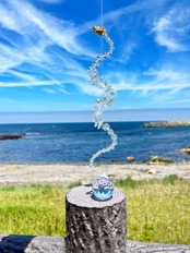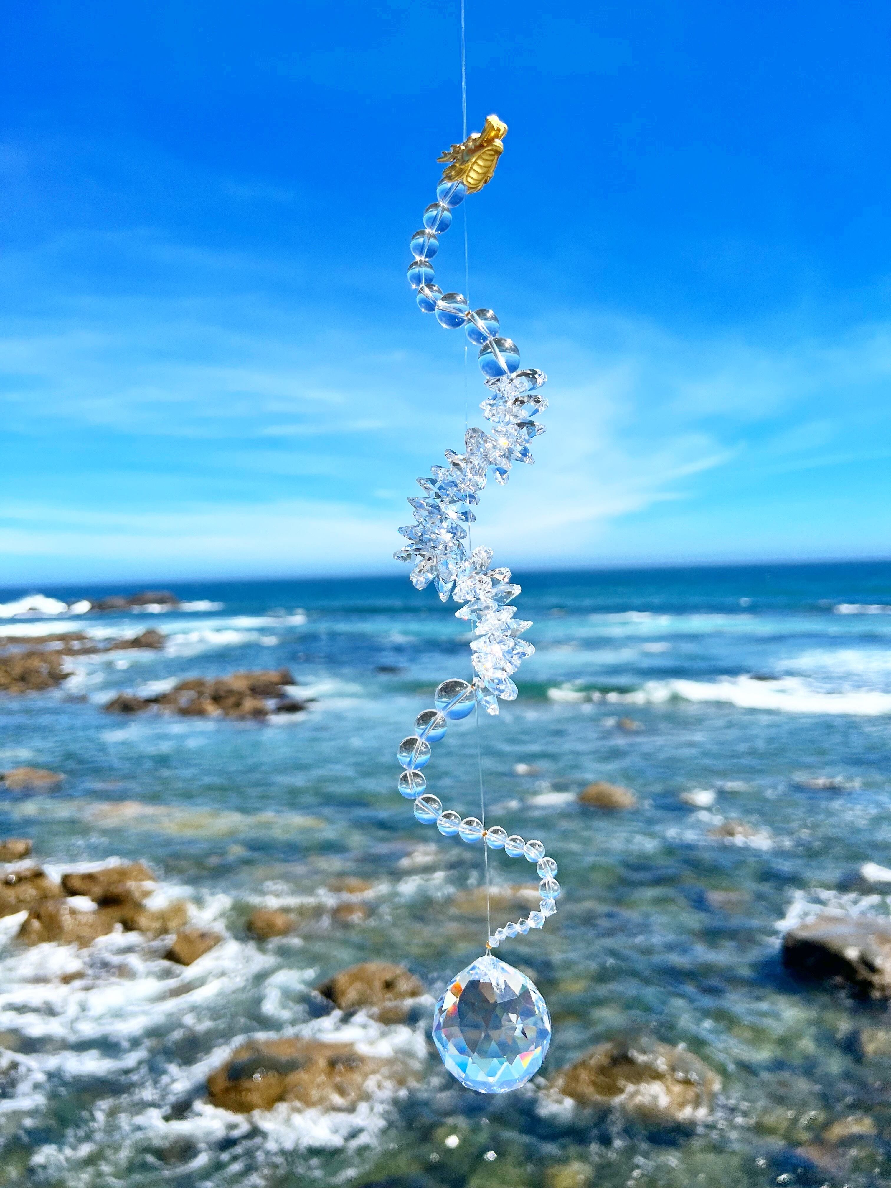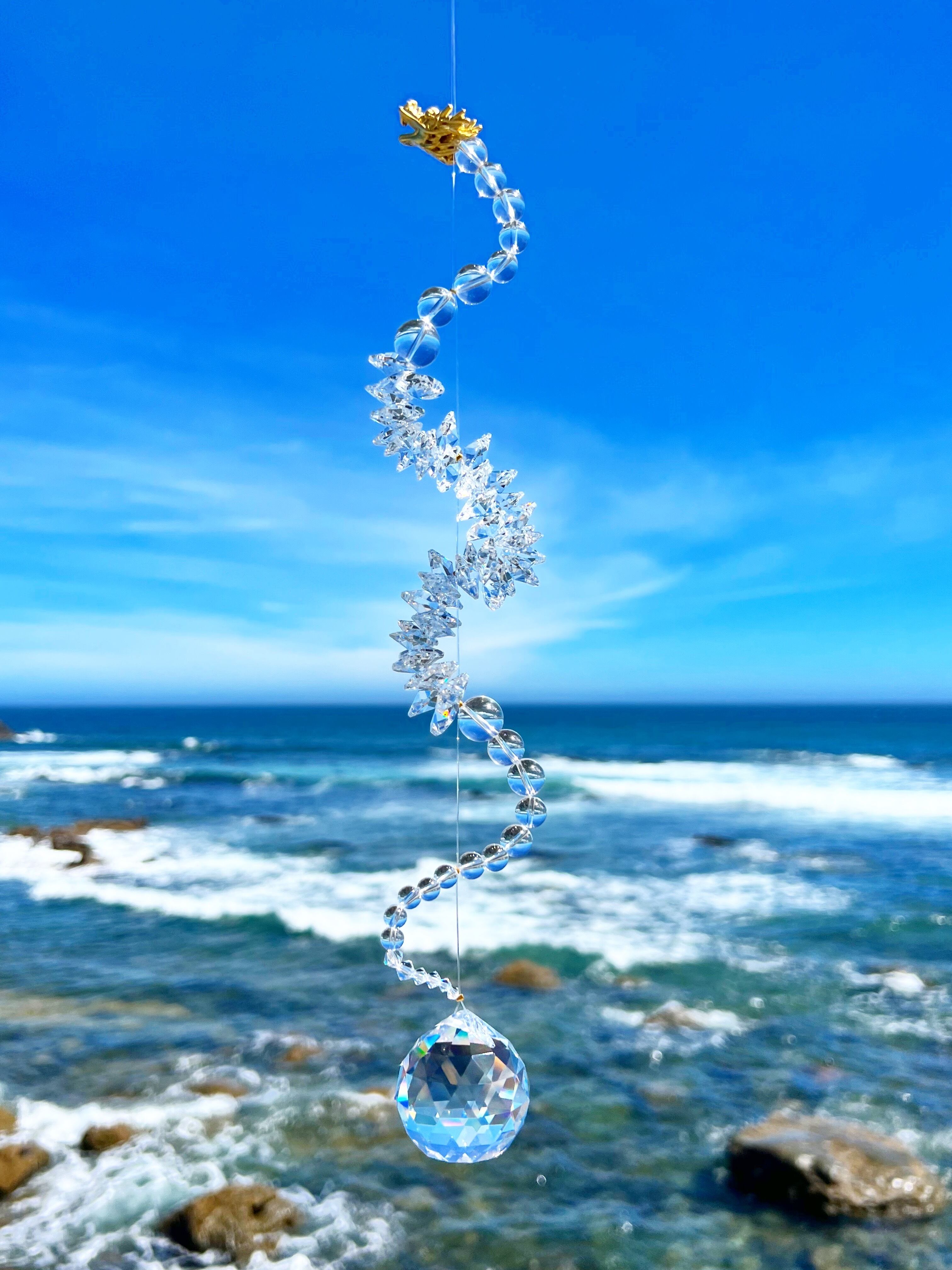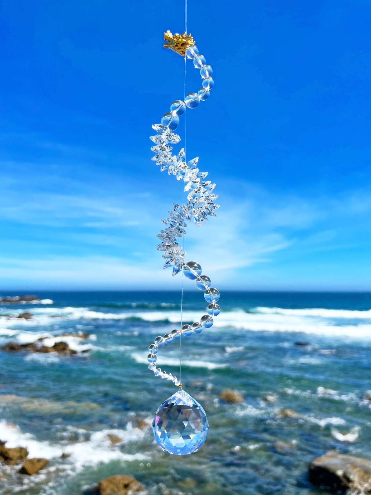 「龍神サンキャッチャー(龍の顔が上向きバージョン)」は、力強い龍のエネルギーを宿した特別なアイテムです。光を浴びることで美しい水晶の光が広がり、開運を促進する力を持っています。