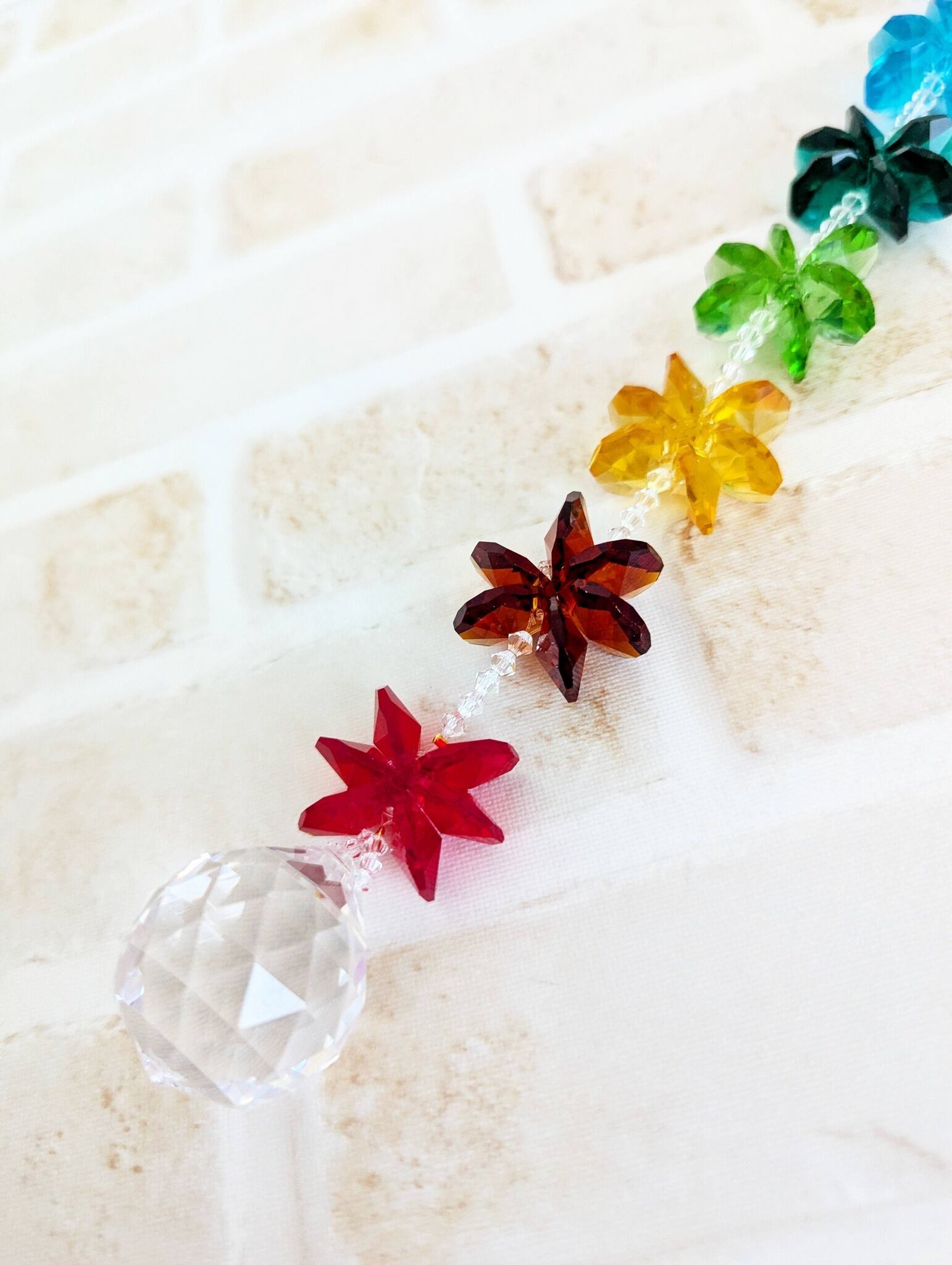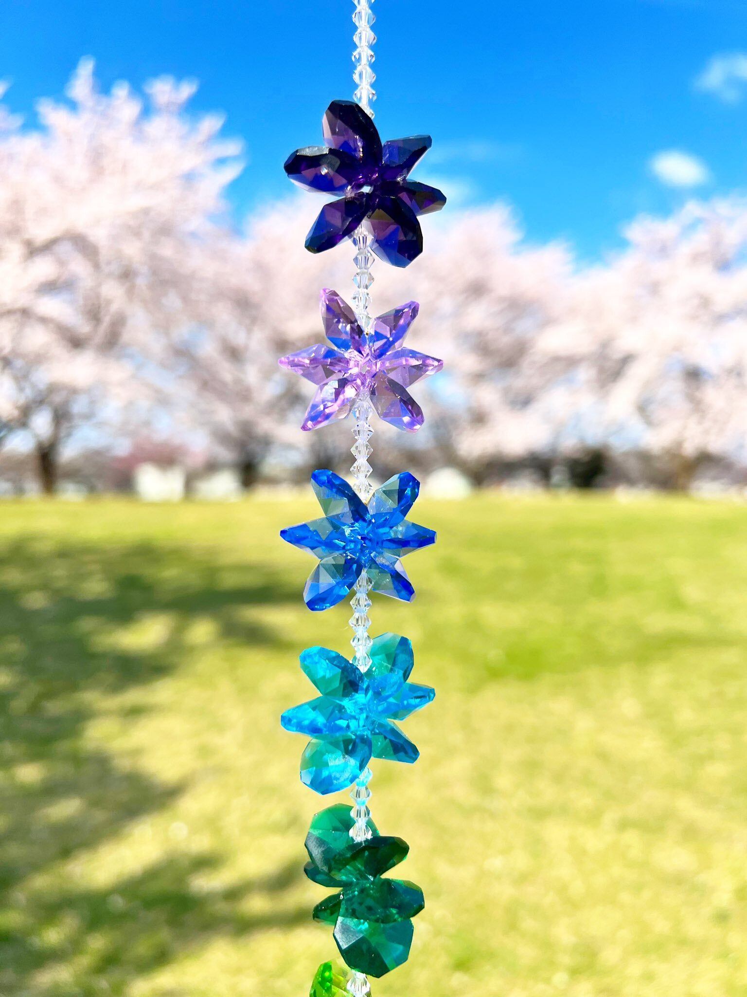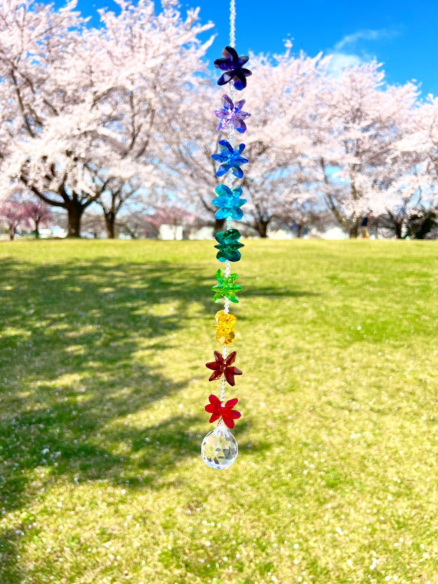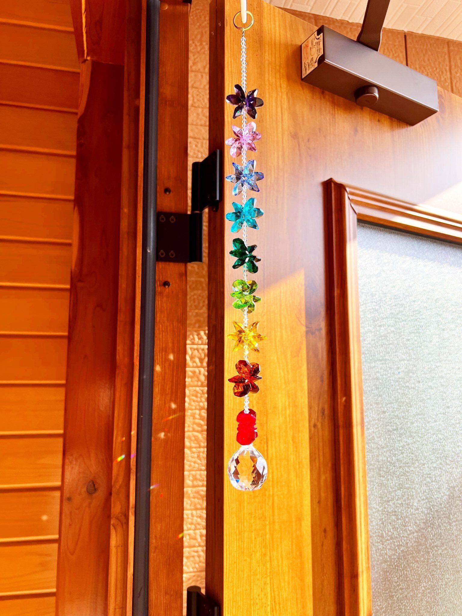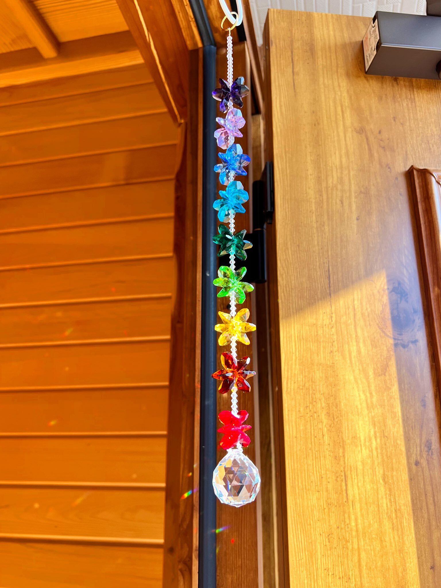 虹色の花が流れるように連なり、光を受けるたびに空間いっぱいへと輝きが広がるサンキャッチャーです。